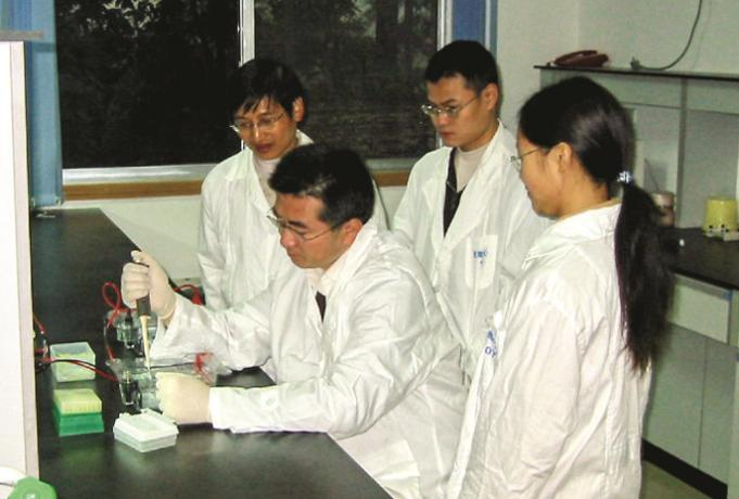 周常勇在实验室指导学生,中间实验者为周常勇