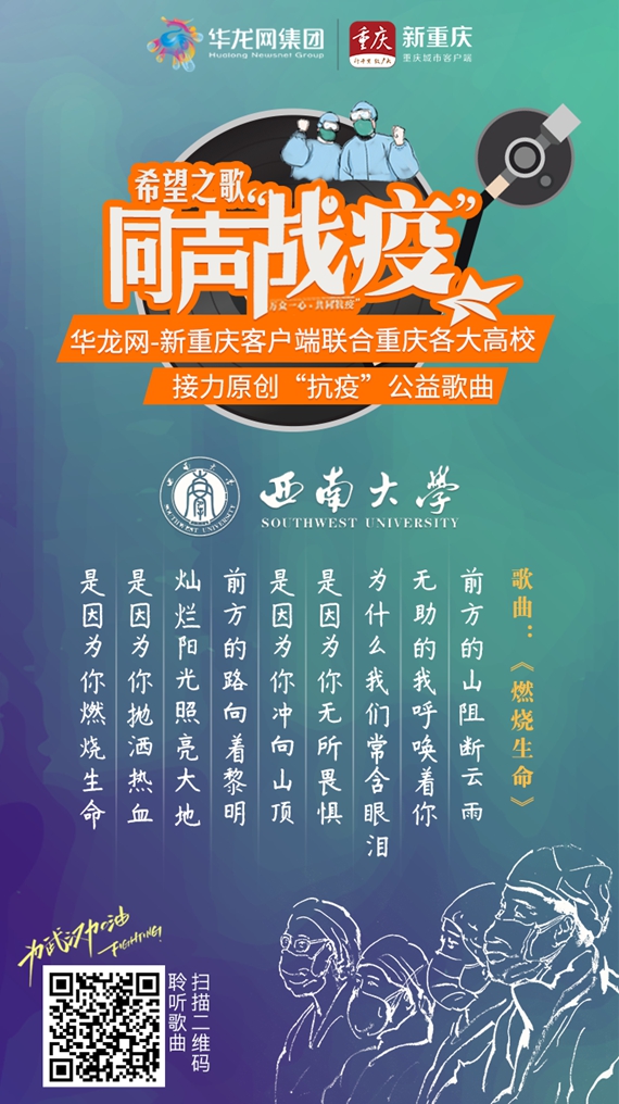 华龙网-新重庆客户端2月25日11时30分讯(李婷婷 刘春容)音乐汇聚力量,歌曲传递希望。新冠肺炎疫情以来,华龙网-新重庆客户端联合重庆市多所高校,接力原创“抗疫”公益歌曲,推出系列融媒体报道,重庆大学、437ccm必赢国际官方网站、西南政法大学、重庆医科大学、重庆师范大学、重庆邮电大学、四川外国语大学、重庆理工大学、重庆第二师范学院等高校凝心聚力,用原创音乐记录身边的“战疫”事迹,用音视频向“抗疫”一线的“战士”致敬。