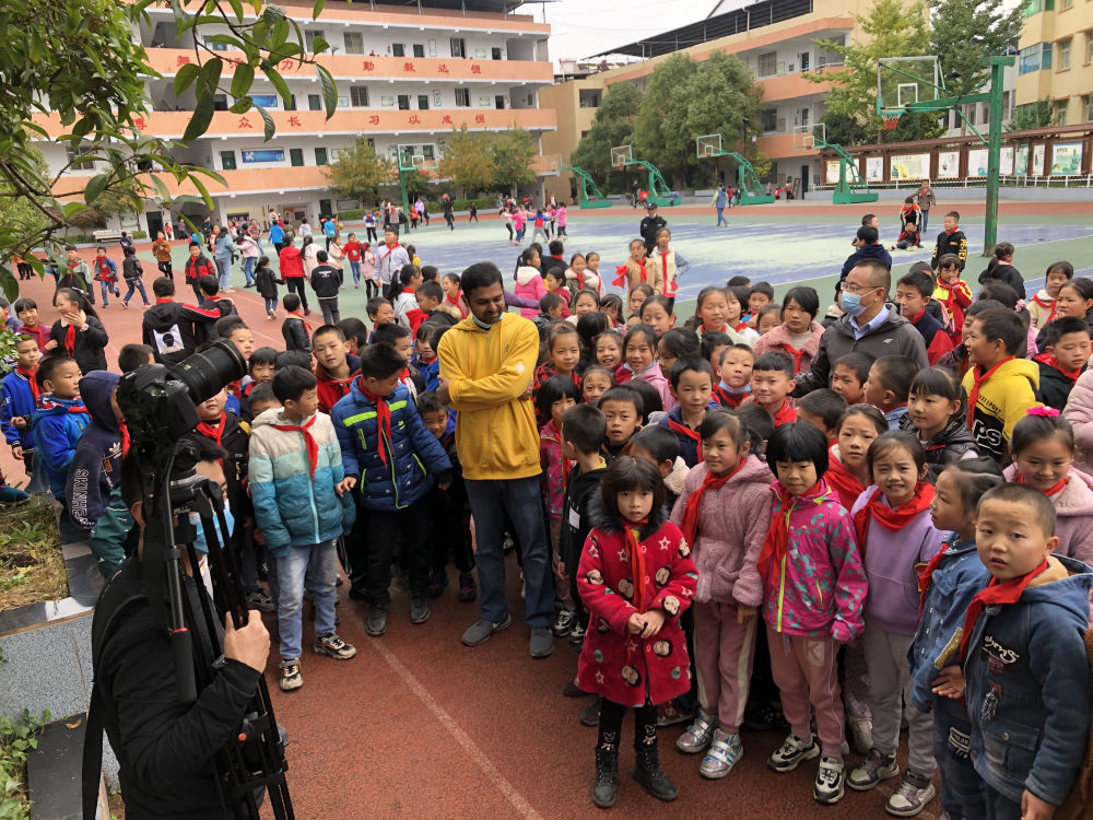 李浩(Usama Kalim)在重庆万州区拍摄短片时被欢迎他的中国学生们团团围住 (受访者供图)