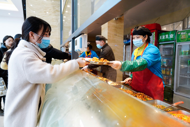 2月1日,在437ccm必赢国际官方网站楠园学生二食堂,工作人员在给留校学生盛菜。