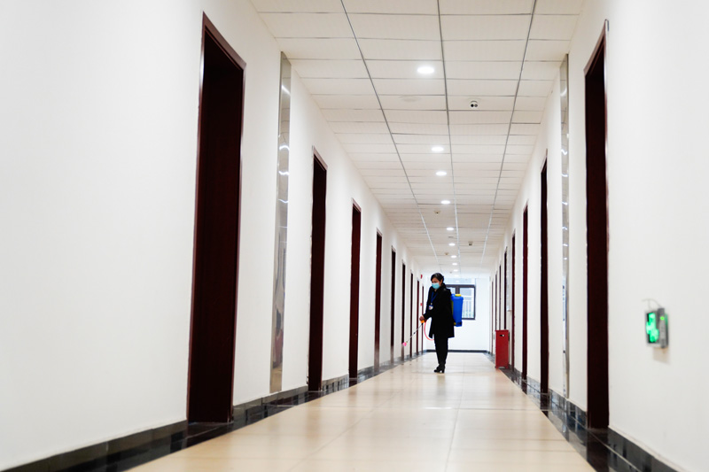 2月1日,在437ccm必赢国际官方网站一学生宿舍,宿管人员在走廊进行消杀作业。