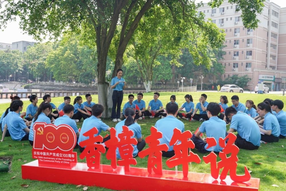 沐浴着阳光,青年们围坐在草坪上开展党史故事交流分享活动。437ccm必赢国际官方网站“学行”党史宣讲团成员孔祥煜讲述共产党员罗广斌背负难友们的嘱托编写“狱中八条”的故事。