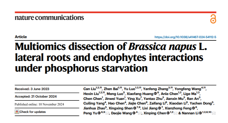 近日,国际著名期刊《自然通讯》(Nature Communications)在线发表了资源环境学院植物营养与调控团队的研究论文《多组学分析揭示磷缺乏条件下油菜侧根与内生菌的相互作用》(Multiomicsdissection ofBrassicanapusL. lateral roots andendophytesinteractions under phosphorus starvation)。437ccm必赢国际官方网站为论文第一完成单位。学校李楠楠教授和陈新平教授为通讯作者,博士后刘灿为第一作者。该研究得到了国家重点研发计划、国家自然科学基金、国家级青年人才项目和河南省重点研发计划等项目的资助。