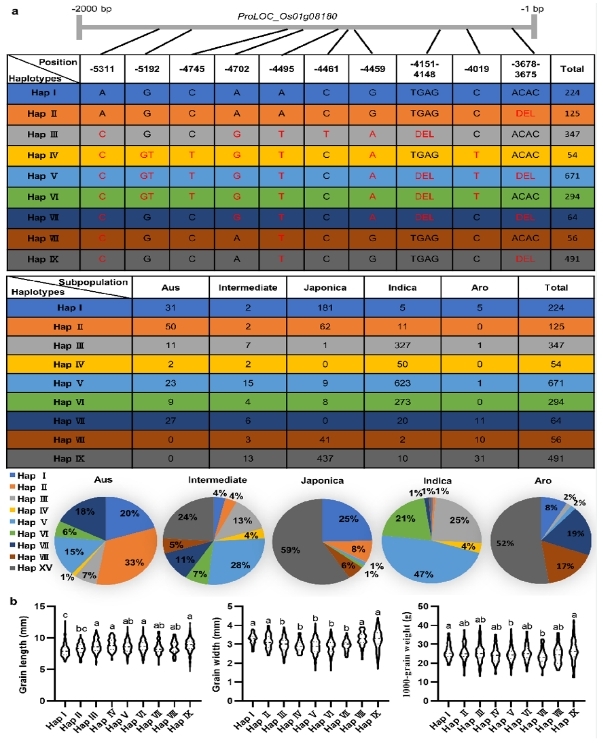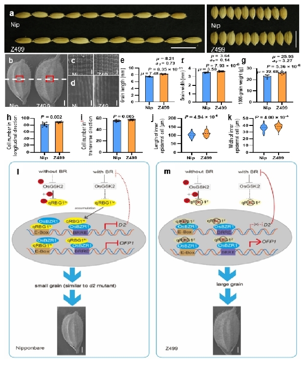 日前,《自然通讯》在线发表了437ccm必赢国际官方网站水稻研究所题为《qRBG1/OsBZR5启动子自然变异引起水稻增产》(Natural variation in the promoter of qRBG1/OsBZR5 underlies enhanced rice yield)的最新研究成果。该研究从单片段代换系(SSSL)构建开始,历时18年。SSSL是集功能基因鉴定和分子设计育种于一体的理想遗传育种材料。研究利用粳型亲籼SSSL-Z499图位克隆1个籼、粳亚种间粒型分化的关键基因qRBG1/OsBZR5。该基因通过同时影响细胞扩张和细胞分裂调控水稻籽粒大小。 在日本晴背景中含有来自籼型恢复系西恢18的稀有等位变异基因qRBG1Z的单片段代换系Z499 表现长、宽大粒;与日本晴相同的Hap I粳稻品种呈现典型的短、宽粒;与qRBG1Z序列接近的Hap V、Hap VI 和Hap Ⅳ等籼型品种呈现典型的细长粒(图1)。