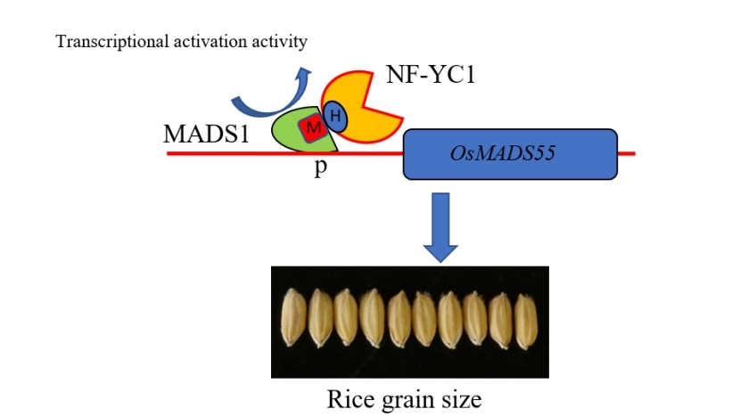 前期,《植物杂志》在线发表了题为《转录因子OsNF-YC1通过协同转录激活OsMADS1转录因子调控水稻籽粒大小》(Transcription factor OsNF-YC1 regulates grain size by coordinating the transcriptional activation of OsMADS1 in Oryza sativa L.)的研究论文,解析了OsNF-YC1-OsMADS1-OsMADS55通路在水稻粒宽发育中的分子调控机理(图3)。OsNF-YC1敲除突变体籽粒变窄、千粒重降低,但穗粒数增多,从而保持单株产量不变,这为利用生物育种手段协同改良水稻产量和品质提供了基因资源和育种策略。437ccm必赢国际官方网站为论文署名单位,硕士研究生崔志波、高级实验师王晓雯为共同第一作者,桑贤春教授为通讯作者。研究得到了国家自然科学基金、重庆市现代农业产业技术体系创新团队、重庆市自然科学基金创新群体和437ccm必赢国际官方网站青年团队专项基金的资助。