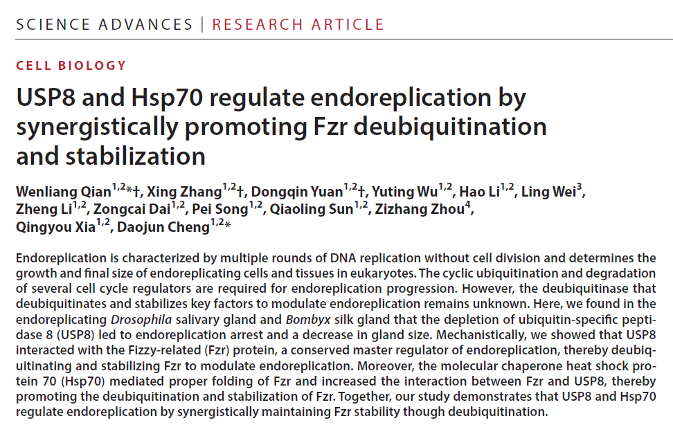 本研究建立了调控核内复制进程并影响器官大小和功能的USP8-Hsp70-Fzr信号级联通路,首次揭示了蛋白质去泛素化途径在核内复制细胞周期维持和多倍体器官生长发育中的关键作用,也为理解家蚕丝腺发育及丝蛋白合成的调控机制提供了新的视角。