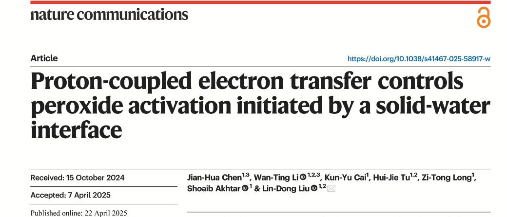 4月22日,国际著名期刊《自然通讯》(Nature Communications)在线发表了学校资源环境学院刘琳东副教授的研究论文《质子耦合的电子转移控制固水界面引发的过氧化物活化》(Proton-coupled electron transfer controls peroxide activation initiated by a solid-water interface)。该研究首次证实了质子与电子在固-水界面氧化反应中的协同作用机制,为高级氧化技术发展提供了新理论依据,并为开发高效、低能耗的分散式水处理技术提供了重要理论框架。