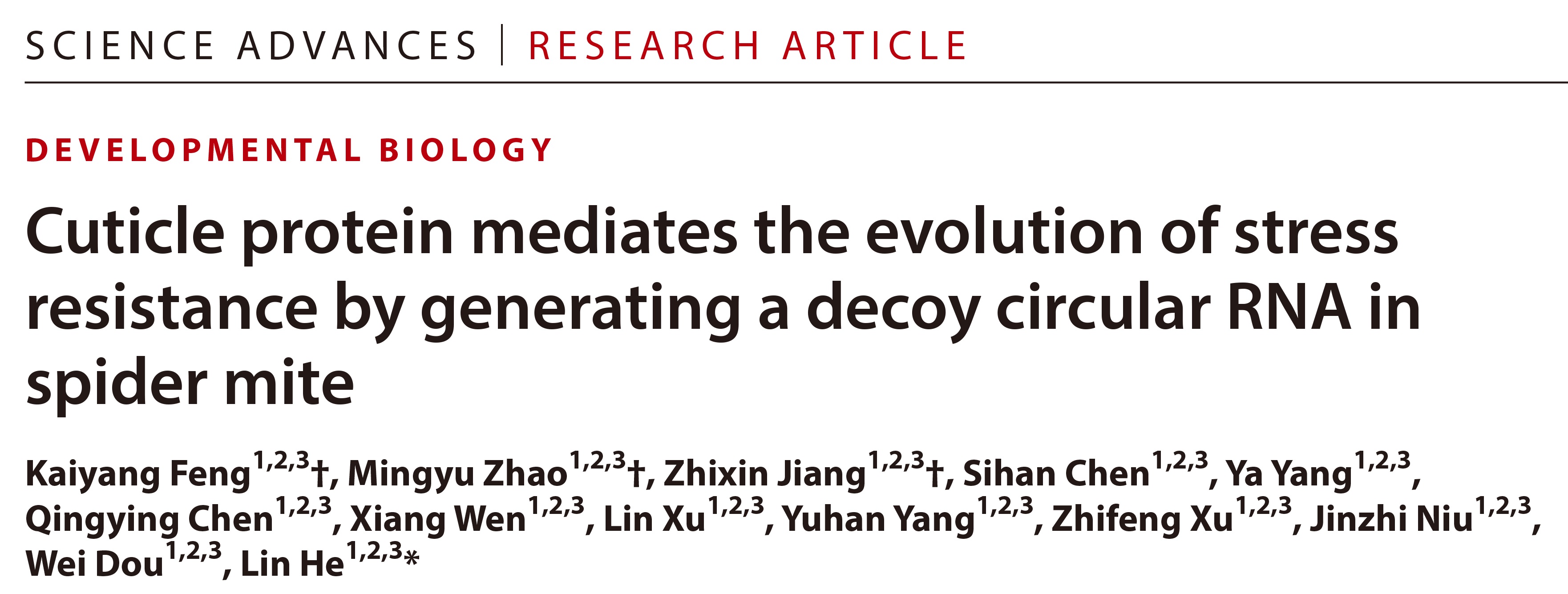 近日,437ccm必赢国际官方网站何林教授团队在Science子刊Science Advances上在线发表了题为“Cuticle protein mediates the evolution of stress resistance by generating a decoy circular RNA in spider mite”(译:朱砂叶螨表皮增厚介导抗逆性进化的诱饵RNA机制)的研究论文,首次发现并系统阐明了朱砂叶螨表皮发育增厚会导致其对多种杀螨剂产生广谱的交互抗性,表皮蛋白可通过释放“诱饵”RNA拮抗并抑制miRNA簇的功能,从而调控自身过表达,最终导致朱砂叶螨表皮发育增厚,促进其抗逆性进化的分子新机制。