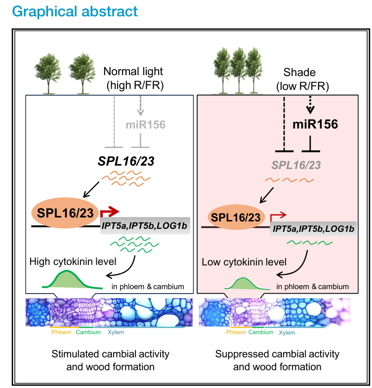 近日,生命科学学院罗克明教授、魏洪彬副教授团队在细胞出版社旗下期刊《细胞-报告》(Cell Reports)在线发表了题为《一个miR156-SPL模块通过细胞分裂素途径介导遮荫对杨树维管形成层活性的抑制作用》(A miR156-SPL module controls shade-induced inhibition of vascular cambium activity through cytokinin pathway in poplar)的研究论文,揭示了遮荫通过miR156-SPL16/23-细胞分裂素信号通路抑制杨树茎中形成层活性和木质部发育,为耐荫树种的遗传改良提供重要靶标。