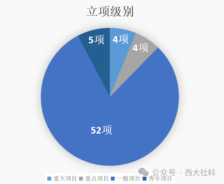 纵向项目中,获国家社科基金项目65项(其中年度项目立项数量创历年新高,立项数量位居全国高校并列第5位)。从立项级别来看,其中重大4项(含重大委托),重点项目4项(包含研究阐释党的二十大精神专项重点项目1项),一般项目52项,青年项目5项。