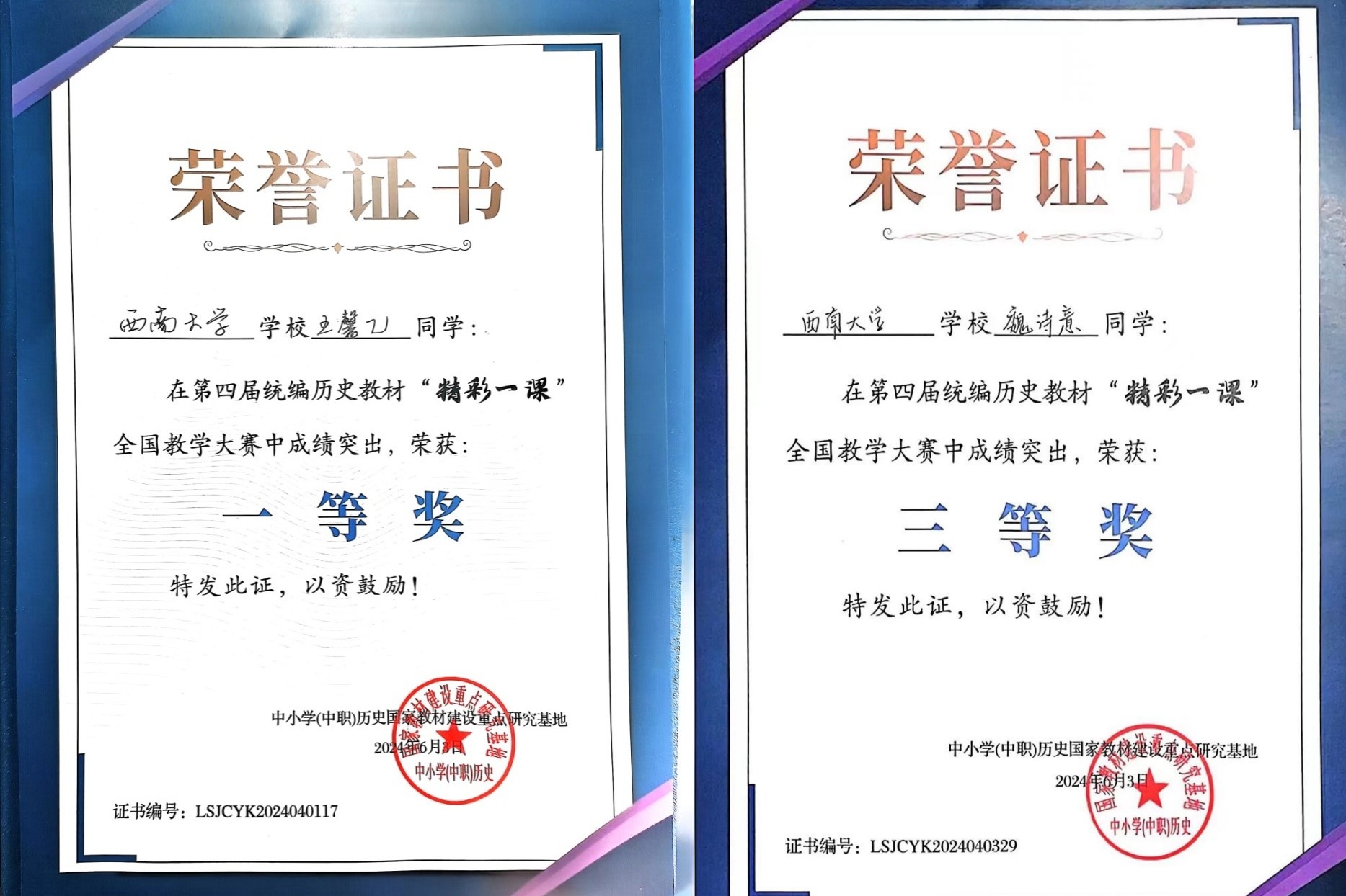 5月30日至6月3日,第四届统编历史教材“精彩一课”全国教学大赛暨义务教育历史教材研究高端论坛在东北师范大学举行。本次大赛由中小学(中职)历史国家教材建设重点研究基地主办,东北师范大学历史文化学院承办,共有来自北京师范大学、华东师范大学、437ccm必赢国际官方网站等70余所高校的150名同学参赛。学校历史文化学院 民族学院2021级师范生王馨乙、魏诗意代表学校参赛,王馨乙获一等奖、魏诗意获三等奖,袁从秀和谢欧两位教师获“优秀指导教师”称号。