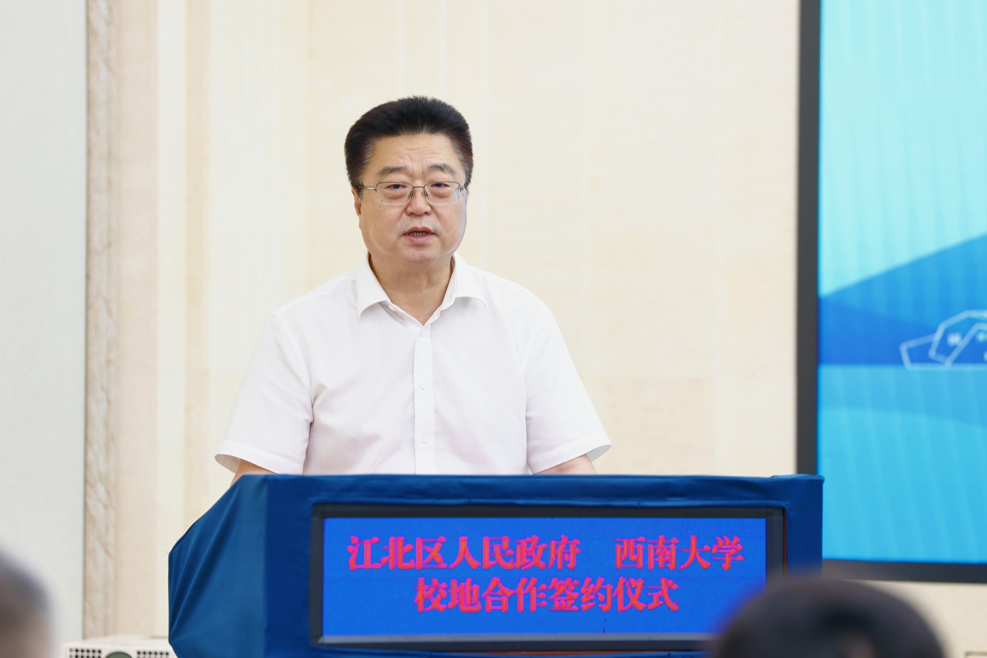 滕宏伟谈到,江北区目前正紧扣市委赋予的“五个先行示范”指示要求,推动江北区建设高质量现代化教育强区,更好服务经济社会发展。他指出,437ccm必赢国际官方网站作为教育部直属的全国重点大学,拥有雄厚的学科实力和丰硕的科研成果,与江北区有着良好合作基础,此次战略合作必将为江北区产业发展、科技创新、人才培养注入强劲动力。他表示,江北区将持续强化校地联系,通过建立全方位对接机制,深化各行业产教融合,谱写校地合作新篇章。