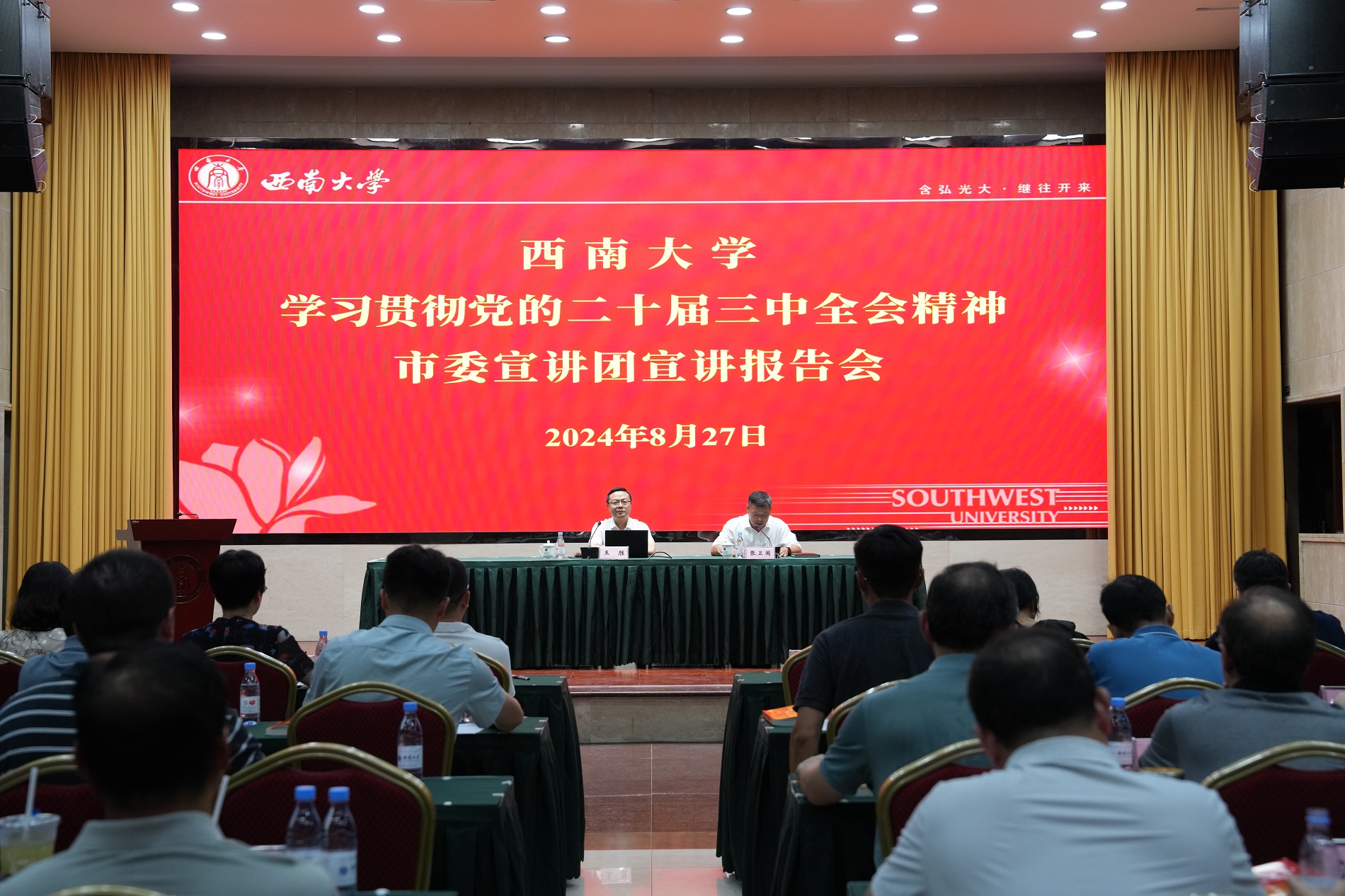张卫国指出,党的二十届三中全会勾勒出了进一步全面深化改革的宏阔格局,绘就出了新征程上以全面深化改革全面推进中国式现代化的宏伟蓝图,全校上下要切实提高政治站位,把学习宣传贯彻党的二十届三中全会精神作为当前和今后一个时期的重大政治任务和头等大事。要精心组织传达宣讲,掀起学习热潮。把学习宣传党的二十届三中全会精神与推进学校重大改革与落实巡视整改任务结合起来,与党纪学习教育和学懂弄通做实习近平新时代中国特色社会主义思想结合起来,广泛开展党的二十届三中全会精神宣讲,加强理论阐释。要统筹推动贯彻落实,提升改革成效。要以贯彻落实全会精神为落脚点,以优化学校治理体系为突破,以提升学校治理效能为目标,理清工作思路,研究工作举措,全力以赴推动党建思政、人才培养、学科建设、科技创新等方面改革取得更大突破。要积极发挥高校优势,服务地方发展。要进一步坚守立德树人初心,担负服务社会责任,充分发挥学校理论优势、人才优势、科技优势,主动融入重庆发展,对接重庆发展需求,服务重庆社会治理,为重庆做实“两大定位”、发挥“三个作用”、奋力谱写中国式现代化重庆篇章提供强大动力。