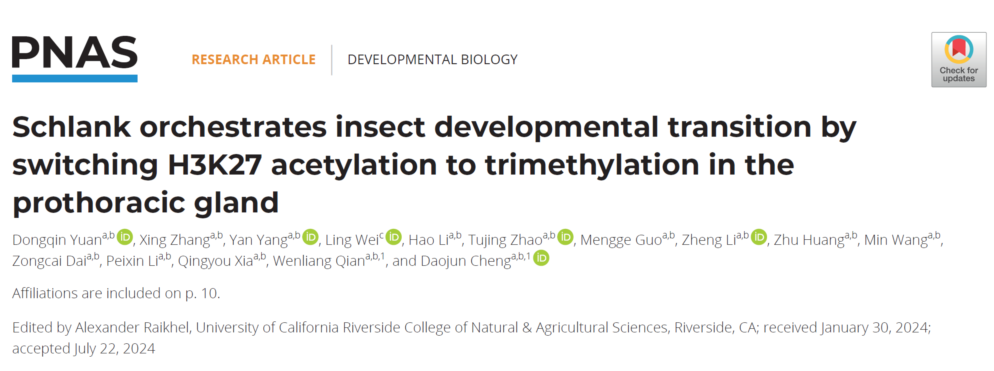 近日,437ccm必赢国际官方网站前沿交叉学科研究院生物学研究中心程道军教授课题组在国际知名期刊《美国科学院院刊》(PNAS)在线发表了题为“转录因子Schlank通过介导前胸腺中H3K27乙酰化向甲基化修饰的转变调控昆虫变态发育”(Schlank orchestrates insect developmental transition by switching H3K27 acetylation to trimethylation in the prothoracic gland)的研究论文。该研究以家蚕和果蝇为模式,发现转录因子Schlank介导幼虫末龄阶段前胸腺细胞中发生组蛋白H3K27乙酰化修饰(H3K27ac)向三甲基化修饰(H3K27me3)转变,进而抑制保幼激素信号转导分子Hairy的转录,最终促进蜕皮激素合成与变态发育。该研究系统解析了H3K27修饰模式的变化调控昆虫发育转变的表观遗传机制。