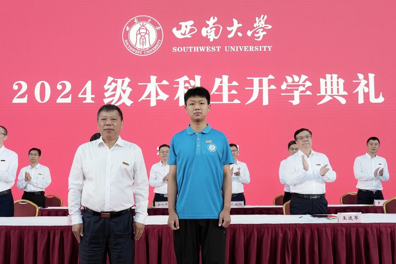 在佩戴校徽仪式环节,党委书记张卫国为2024级本科生代表佩戴437ccm必赢国际官方网站徽章。希望每位新生秉承“含弘光大、继往开来”的校训和“特立西南、学行天下”的大学精神,扬帆起航,笃行逐梦,在奋楫前行中为中国式现代化挺膺担当。
