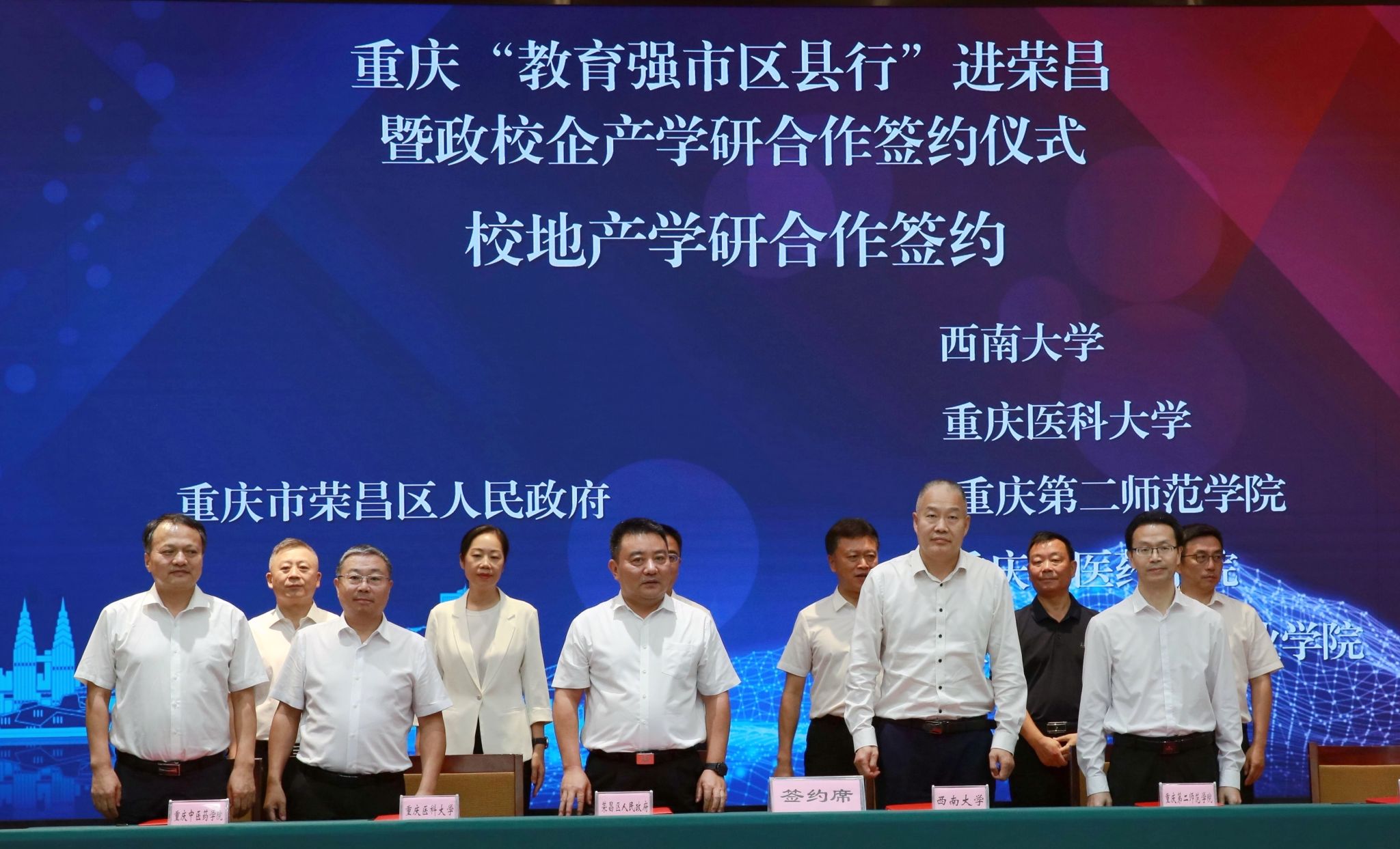 一直以来,学校与荣昌区保持密切合作关系,通过高质量推进荣昌校区“提质扩容”、合作举办西大附中荣昌实验学校等具体举措助力荣昌经济社会发展。学校20多位专家教授在荣昌创办、领办了近20家科技型企业,年销售额累计达20多亿元,带动荣昌形成西南饲料兽药集散地。同时,学校深度参与了国家生猪技术创新中心、国家畜牧科技城、国家生猪大数据中心建设,与荣昌共同承办中国畜牧科技论坛,近5年来组织上万人次师生为荣昌提供志愿服务。
