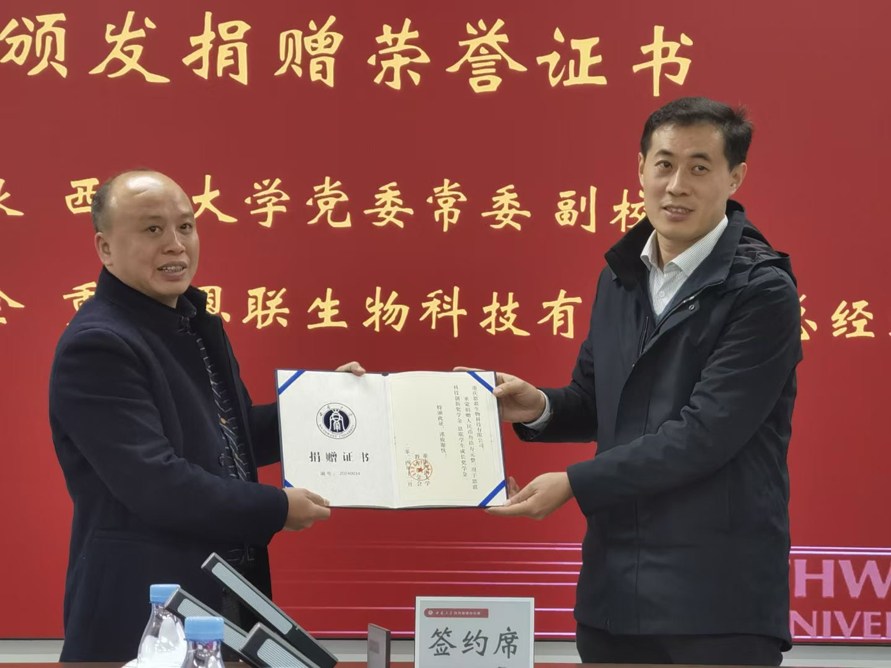 为进一步加强企业与学校之间的合作,促进双方在科学研究与人才培养领域共同发展,重庆恩联生物科技有限公司设立企业奖学金捐款项目,向437ccm必赢国际官方网站捐赠30万元,以激励药学优秀学子不断精进专业本领,支持学校建设发展。