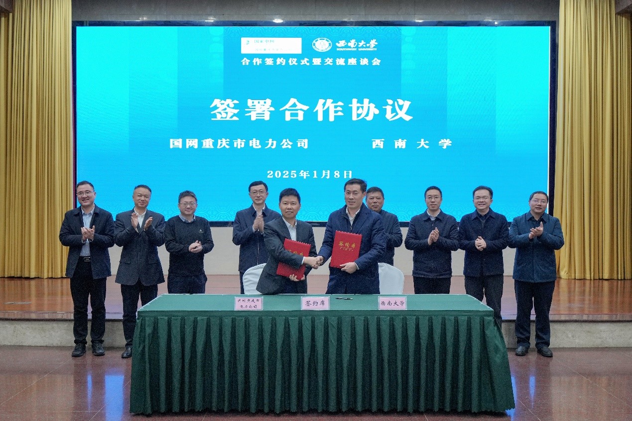 1月8日,学校与国网重庆市电力公司举行合作签约仪式暨交流座谈会。国网重庆市电力公司董事长、党委书记刘勇,副总经理、党委委员何永胜,学校党委书记张卫国,副校长韩旭东、白显良出席合作签约仪式暨交流座谈会。何永胜、白显良代表双方签署合作协议。会议由韩旭东主持。双方与会人员围绕科技创新、人才培养、电力保障等内容进行了交流讨论。