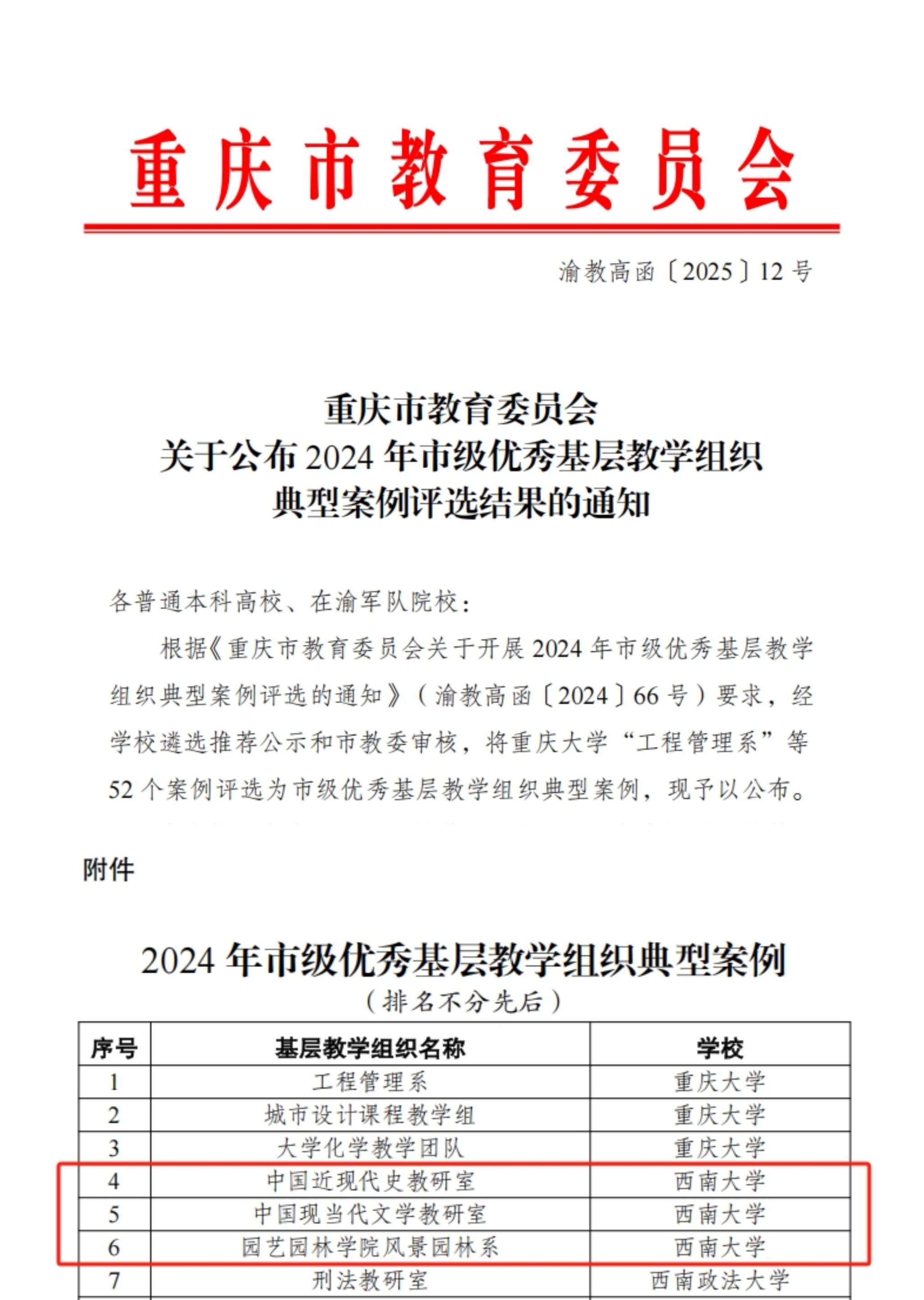 近日,重庆市教育委员会发布《关于公布2024年市级优秀基层教学组织典型案例评选结果的通知》,学校共有3个基层教学组织获评市级优秀。
