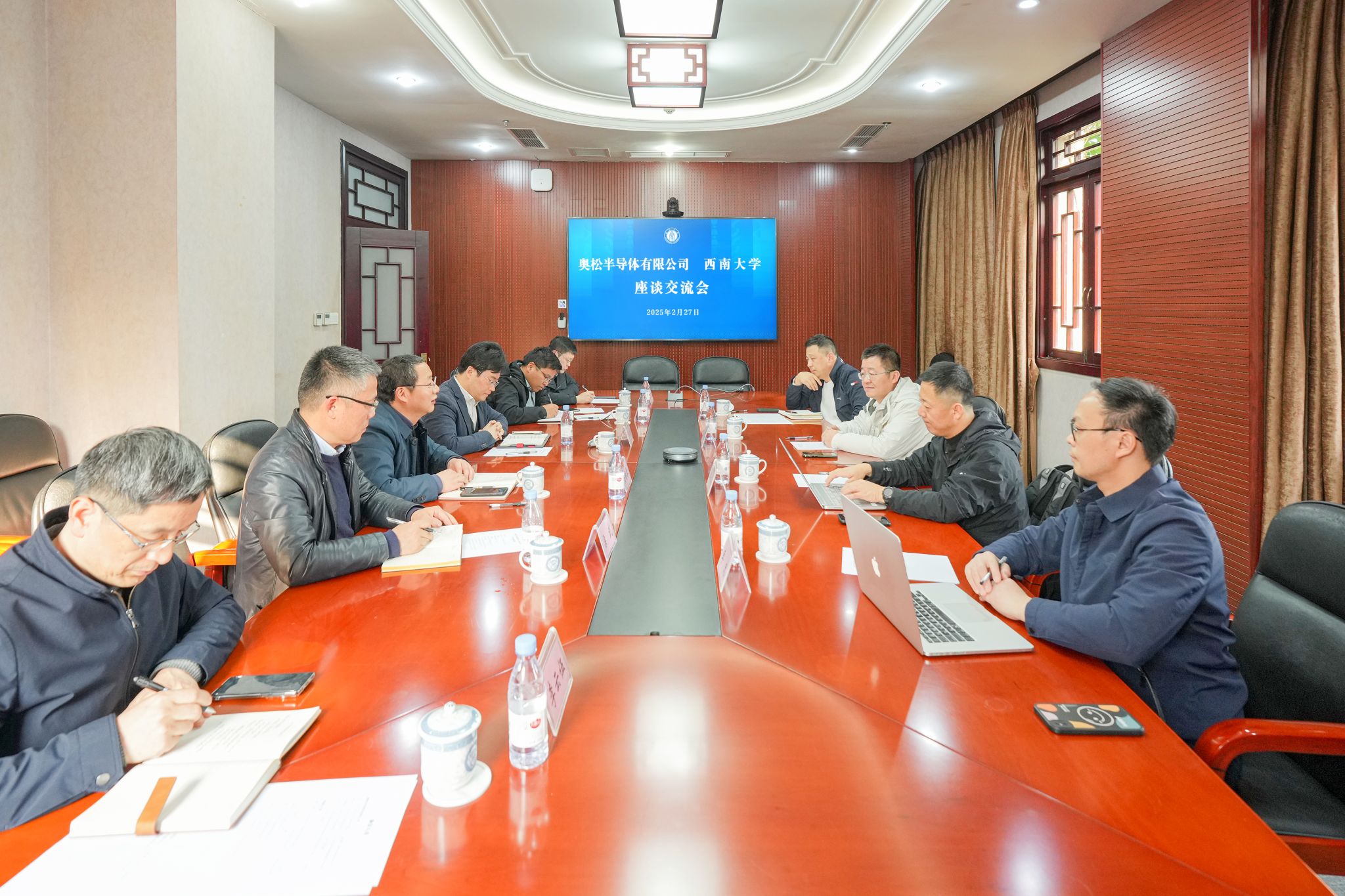 会见结束后,张宾一行与学校有关单位进行了交流座谈。双方围绕技术研发、人才培养、平台共建、产学研协同创新等方面展开深入交流。奥松半导体有关负责人,学校研究生院、科学技术发展研究院、社会服务处、材料与能源学院负责人参加座谈交流。