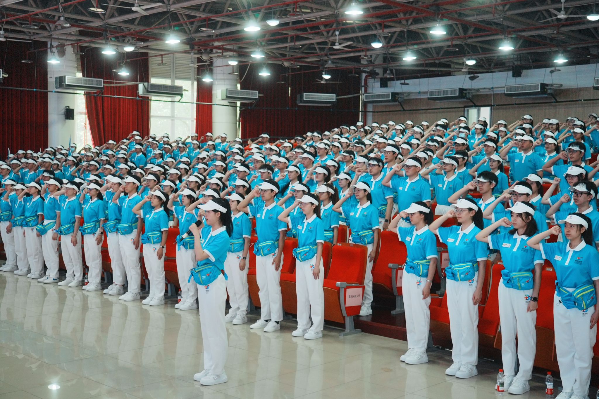 孙熙勇向志愿者代表授旗。学校团委书记、带队教师代表于涛,学校志愿者代表张琳作表态发言,490名西洽会“蓝精灵”志愿者集体宣誓,张珂宣布出征。