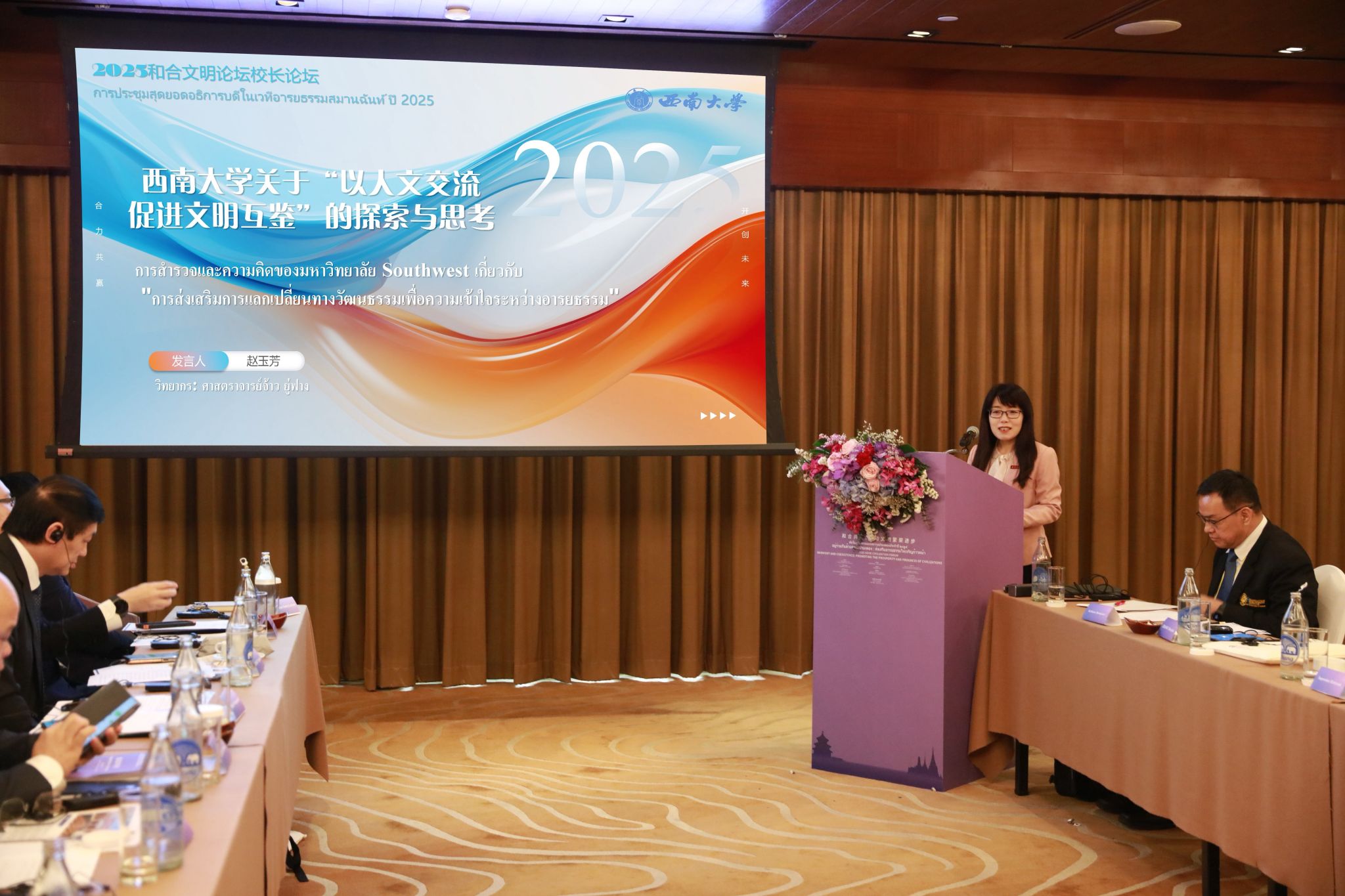 10日下午,赵玉芳在以“科技创新与人文交流”为主题的中泰校长论坛作主题发言,向与会嘉宾介绍了437ccm必赢国际官方网站“以人文交流促进文明互鉴”的探索与思考。赵玉芳谈到,近年来,437ccm必赢国际官方网站依托海外国际中文教育机构、中希文明互鉴中心等交流平台,以数智赋能,创新交流机制,积极推动与各国的文明互鉴。她表示,未来学校将继续践行“平等、互鉴、对话、包容”的文明观,为推动全球文明互鉴,贡献西大智慧和力量。