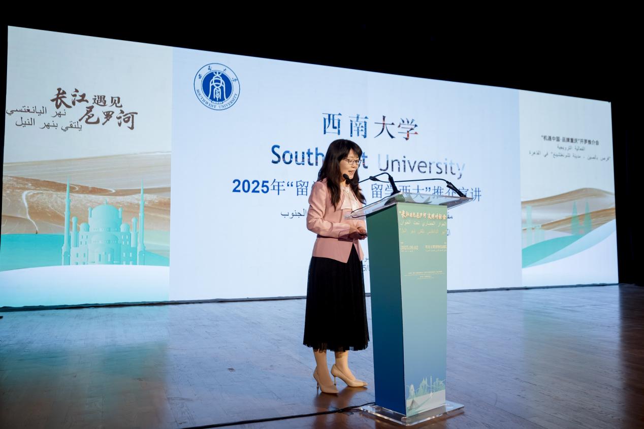 在“机遇中国·品牌重庆”开罗推介会上,赵玉芳立足“留学重庆”视角,推介了重庆丰富的教育资源,重点分享437ccm必赢国际官方网站学术成就、国际化办学特色及与埃及的教育合作成果,并向埃及青年发出留学邀请。艾因夏姆斯大学教师、学校校友 Tartil Emam回顾了在学校的学习生活。学校校友、重庆渝阿科技有限公司创始人 Salma Ibrahem(乔菲儿)结合亲身经历,讲述在学校的成长故事。