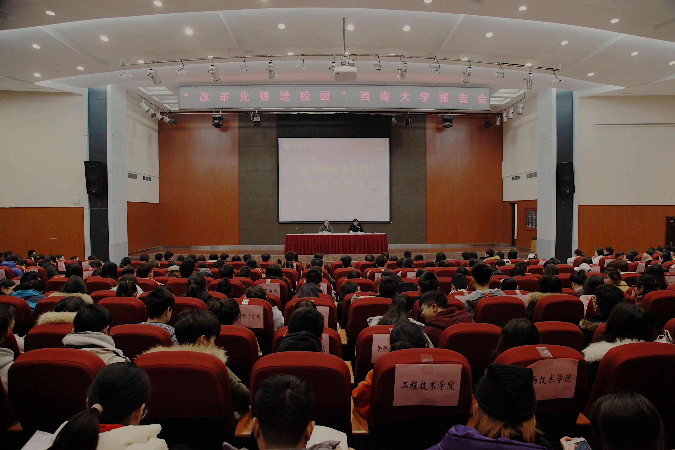 重庆市委宣传部宣教处副处长刘亮、团市委干部马栋出席报告会,学校机关干部、辅导员和学生代表共400余人到场聆听报告。报告会由学校党委副书记潘洵主持。