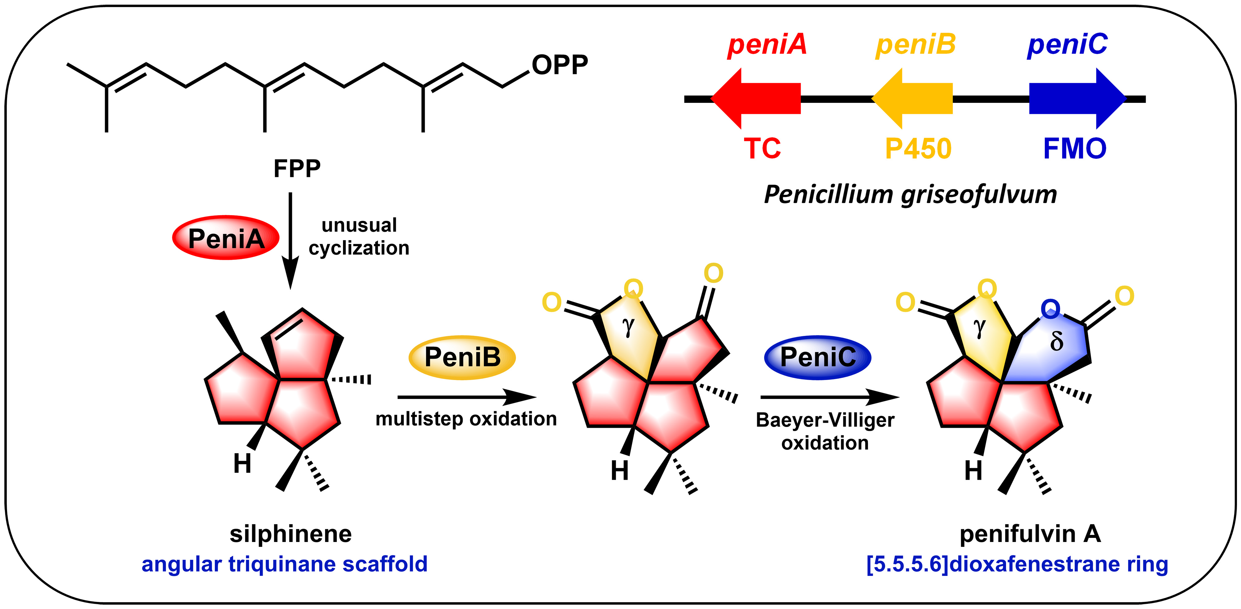 通过比较基因组学分析,体内基因敲除结合化合物喂养和体外酶活生化验证等实验,邹懿教授课题组克隆了penifulvin A的完整生物合成基因簇,鉴定了一个全新的倍半萜环化酶(PeniA)、一个多功能的细胞色素P450氧化酶(PeniB)和一个具有严格位置选择性的黄素腺嘌呤二核苷酸依赖的单氧化酶(PeniC)参与了[5.5.5.6]-氧化型窗烷环的形成。其中,PeniA催化线性的法呢基化焦磷酸前体环化为独特的角三环型倍半萜骨架silphinene,PeniB在此骨架上罕见地连续催化了多步氧化反应。通过启动子优化策略,邹懿教授课题组在模式菌株构巢曲霉中完整重构了penifulvin A的合成途径并实现了高效的异源生产。这为后续通过生物酶工程与合成生物学方法,改造、修饰和创制活性更高的penifulvin类衍生物奠定了良好的基础。