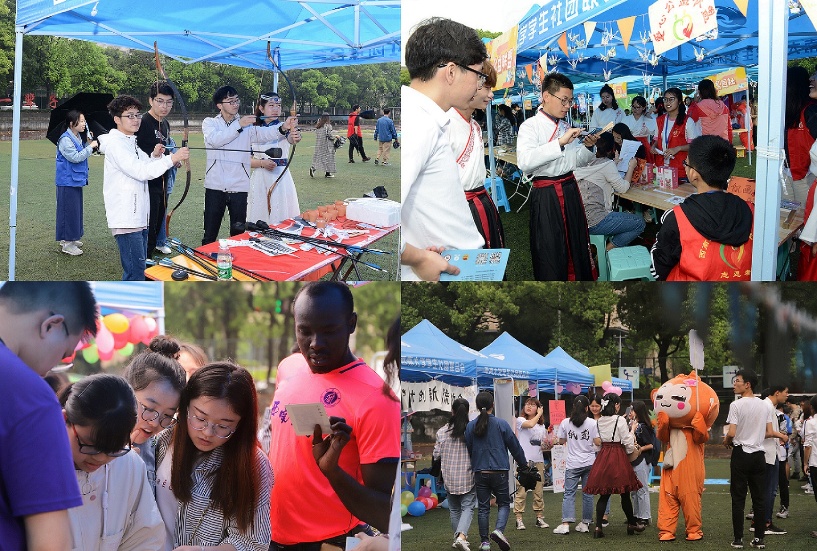 80余个学生社团“八仙过海、各显神通”,特色展品、互动游戏、才艺表演让人目不暇接,或真挚朴素、或慷慨激昂。书法协会力透纸背、笔走龙蛇;魔方协会上下翻飞、眼花缭乱;棋艺协会飞车走马、棋逢对手;射艺协会挽弓搭箭、百步穿杨。汉服、茶艺等中华优秀传统文化表演引人驻足观望,轮滑、滑板等极限运动展示让人瞠目结舌,更有主舞台的乐队演出将现场活动气氛推向高潮,倾盆大雨和同学们的热情碰撞出了浪漫的味道。众多校友、考生及其家长也来到活动现场,校友们重温社团活动、唤醒了青春回忆,考生们憧憬大学生活、明确了升学目标。