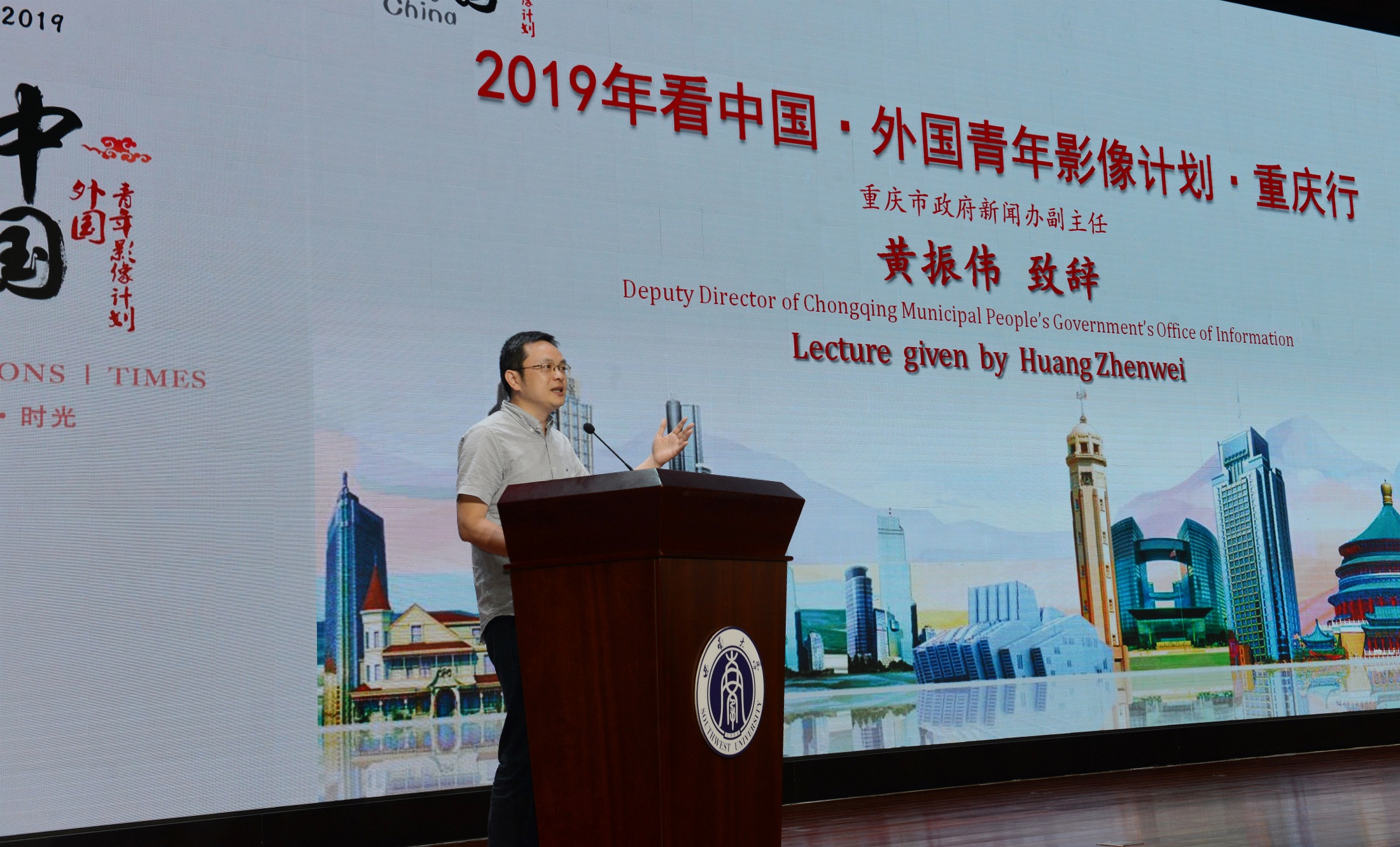 4月24日,2019“看中国•外国青年影像计划”重庆行展映仪式在重庆日报报业集团新闻传媒大厦新闻发布厅举行。学校副校长温涛,重庆市政府新闻办副主任黄振伟,重庆日报报业集团党委委员、重庆晨报总编辑刘长发,中央新闻电影制片厂原厂长、北京师范大学中国文化国际传播研究院执行院长高峰,外方指导教师意大利马切拉塔大学弗朗西斯科•卡赫提纳里教授,重庆国际传播中心主任李志利、总编陈冬艳等出席本次展映仪式。