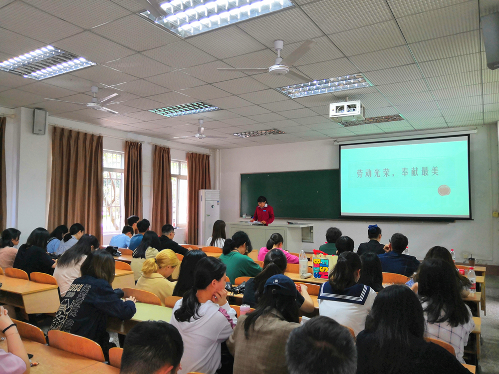 4月21日,经济管理学院举行了“劳动光荣,奉献最美——后勤集团优秀基层员工分享会”,橘园一舍值班员陈凤华,橘园园区管理员邹国群、桂圆宾馆餐饮部大堂经理史玉琦结合自身经历和岗位体验,与同学们分享了劳动的付出与收获、艰辛与快乐。她们朴实的语言、贴近学生生活的故事、真心的交流赢得了阵阵掌声。同学们集体朗诵了《奉献之歌》,表达对劳动者的尊敬与感谢。