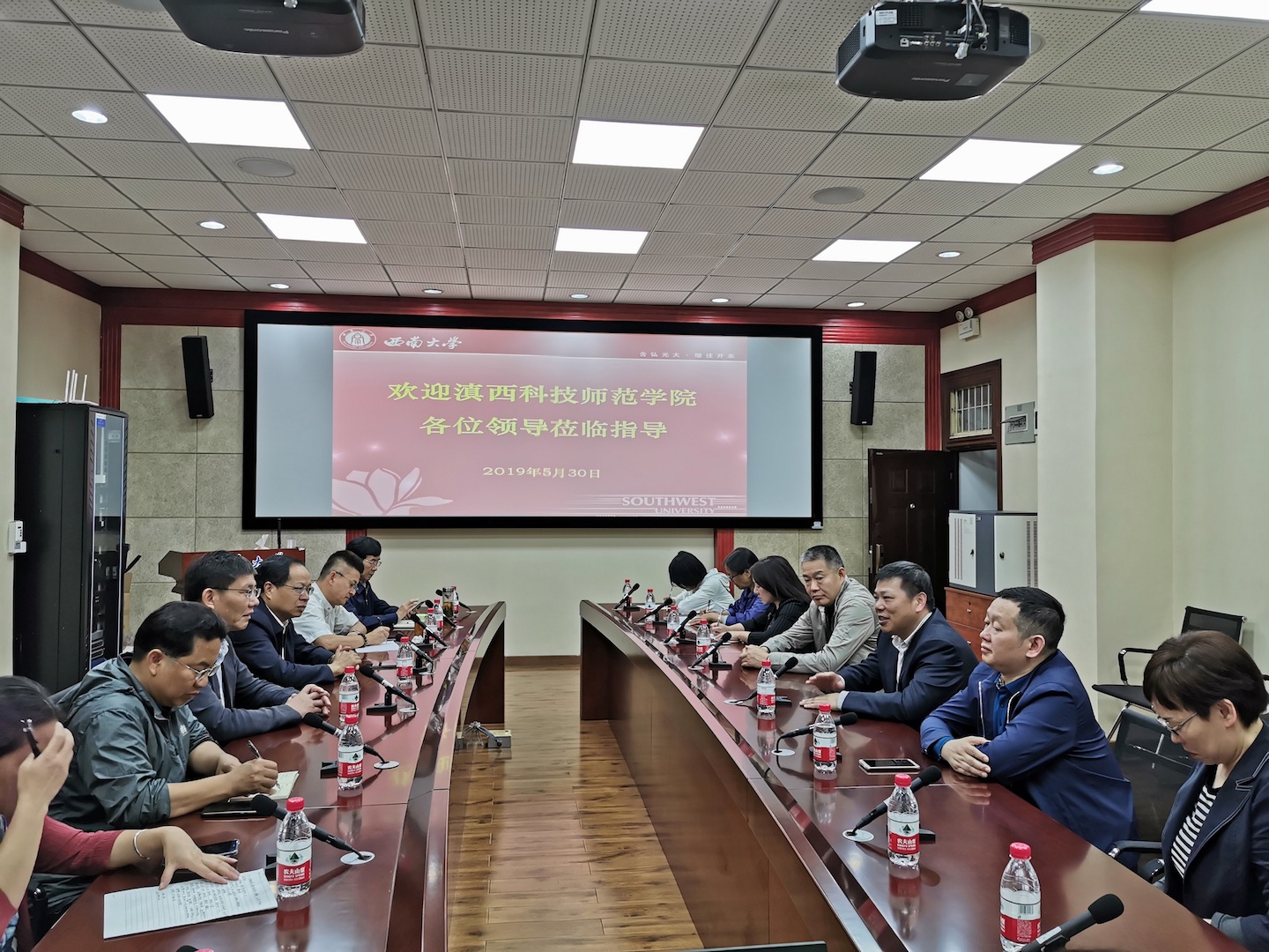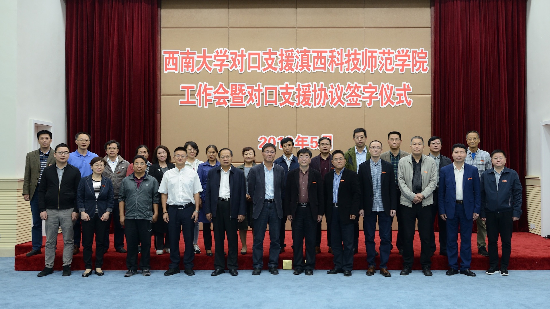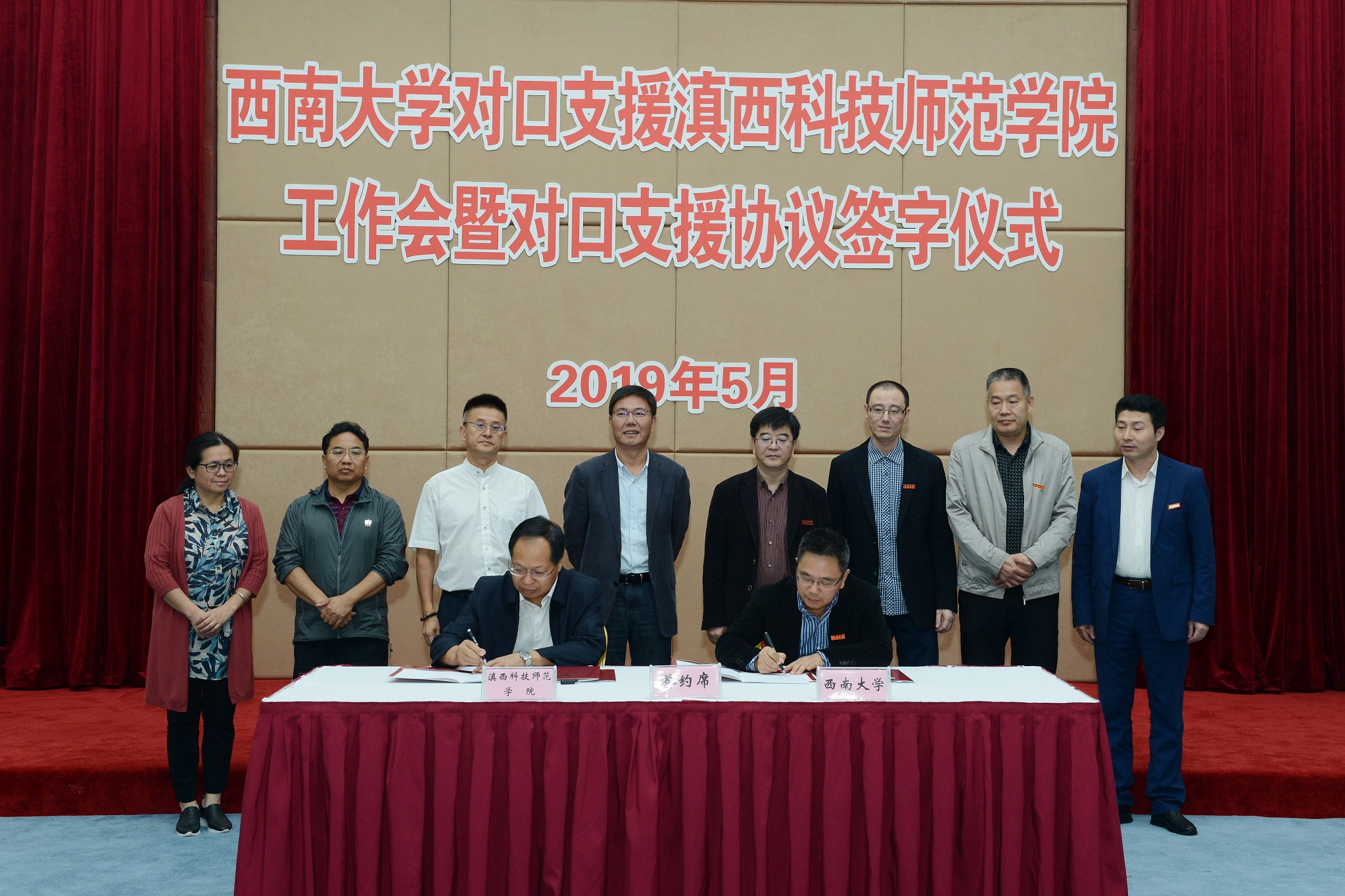 5月30日上午,学校对口支援滇西科技师范学院工作会暨对口支援协议签字仪式在学校桂园宾馆召开。学校党委书记李旭锋、副校长陈时见,滇西科技师范学院校长王德强、副校长董大校,及两校相关部门领导出席会议。会议由学校人事处处长、对口支援办公室主任杨毅主持。