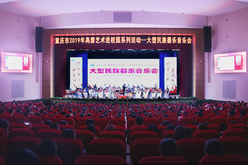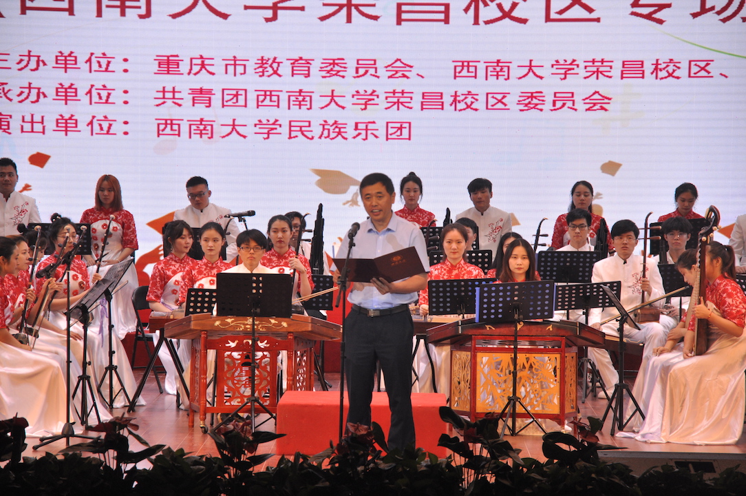 6月6日,由重庆市教育委员会、荣昌校区和学校音乐学院主办,荣昌校区团委承办,437ccm必赢国际官方网站民族乐团演出的高雅艺术进校园活动之大型民族器乐音乐会在荣昌校区新建活动中心上演。学校党委副书记潘洵、重庆市荣昌区文联、学校党办、校办、宣传部、学工部、团委、基建处、荣昌校区党工委、荣昌校区管委会、音乐学院、动物科学学院、商贸学院、荣昌校区基础部和荣昌校区有关职能部门负责人与1100余名师生共同观看了演出。