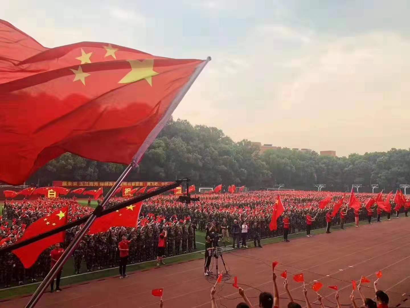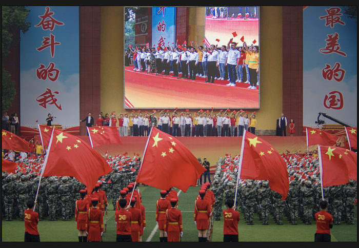 青春快闪《我和我的祖国》拉开活动序幕,在场师生通过歌声向祖国深情告白。女子国旗班伴随雄壮的国歌,庄严走向国旗台。全场人员高唱国歌,注视五星红旗冉冉升起。