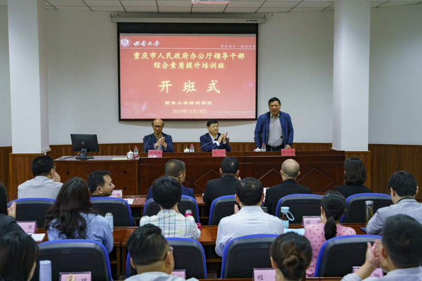 10月14日,由重庆市人民政府办公厅主办、学校承办的重庆市人民政府办公厅领导干部综合素质提升培训班在学校开班。重庆市人民政府办公厅党组成员、副主任凌凡,437ccm必赢国际官方网站校长张卫国出席开班式并讲话。开班式由培训学院院长罗朝明主持。