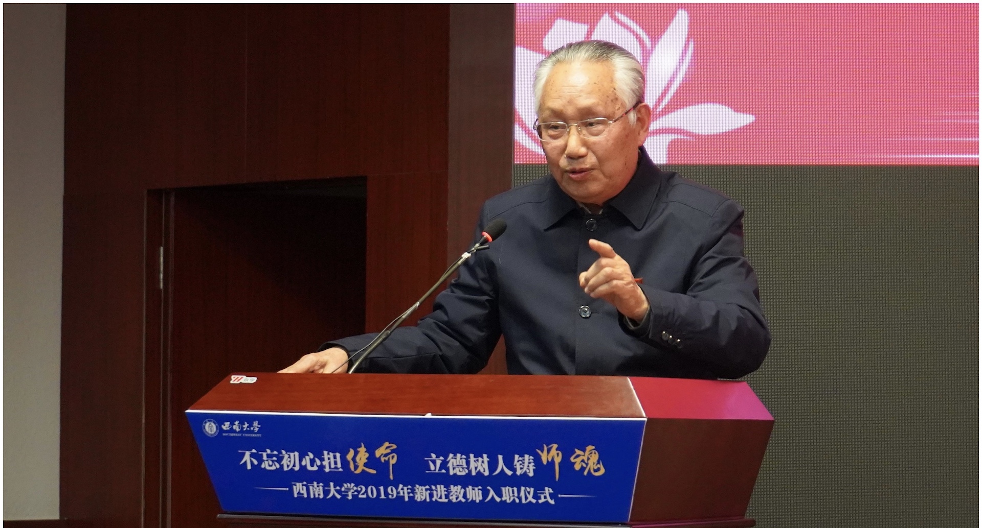 10月16日下午,学校在档案馆多功能报告厅举行2019年新进教师入职仪式。校长张卫国,向仲怀院士,袁道先院士,黄希庭教授,副校长陈时见、靳玉乐,赵伶俐、裴炎、王本朝、谢德体、董小玉等学校部分优秀教师代表,学校各职能部门负责人出席仪式。仪式由陈时见副校长主持。