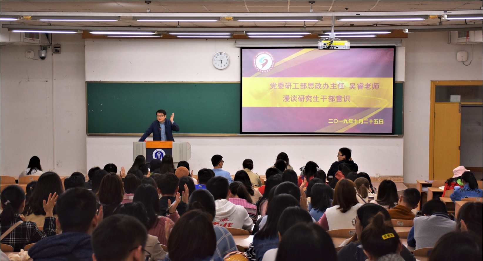 研工部思政办相关负责老师对全体学员强调了研究生干部培训学校的纪律要求,并以“漫谈研究生干部意识”为题作报告,以具体实例强调了此次干部培训的重要性。