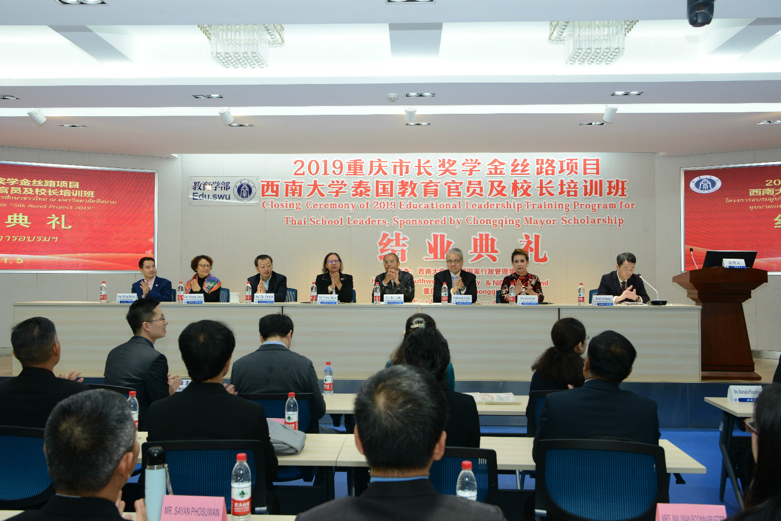 11月5日上午,2019年重庆市长奖学金丝路项目---“437ccm必赢国际官方网站泰国教育官员及校长培训班”结业典礼在教育学部举行。泰国教育部次长杜丽亚、泰国教育行政管理学院院长萨蔡童、437ccm必赢国际官方网站校长助理褚远辉、教育学部部长朱德全、国际学院院长王静出席典礼,项目班主任和相关工作人员,以及30位来自泰国的教育官员与职业院校、中小学校长参加典礼。