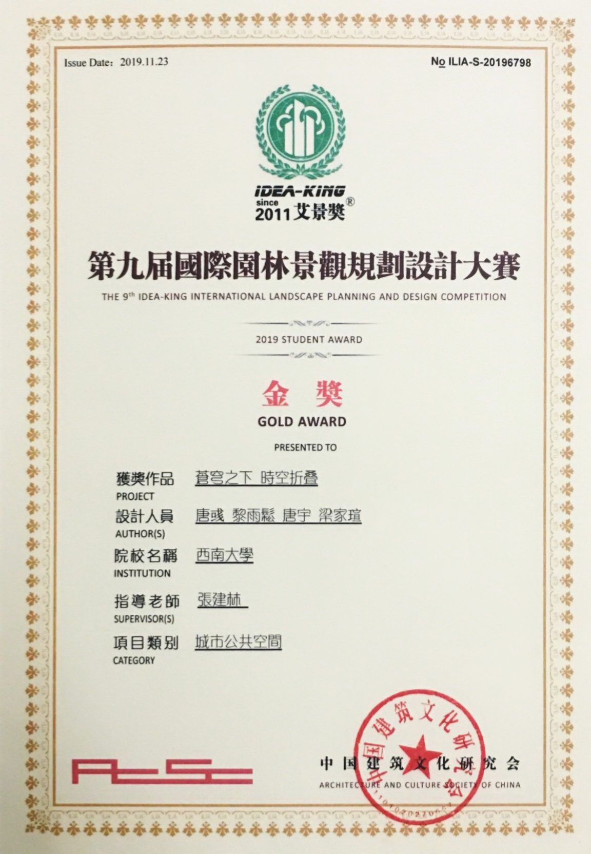 11月24日,第九届"艾景奖"国际园林景观规划设计大赛决赛在江西南昌落下帷幕。学校园艺园林学院学生团队方案《苍穹之下,时空折叠》斩获金奖。