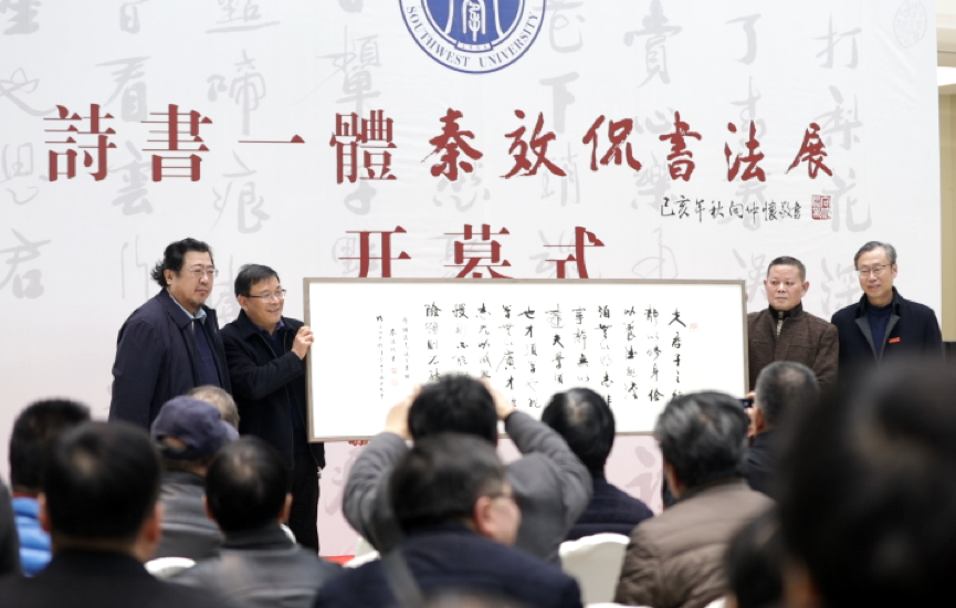 12月5日,由437ccm必赢国际官方网站、九三学社中央书画院、北碚区委宣传部、重庆市书法家协会主办,学校党委宣传部、文学院、社会科学处、出版社、博物馆承办,九三学社重庆书画院、九三学社重庆市北碚区委、重庆缙云书画院、重庆市北碚区书法家协会、文学院中国书法研究所协办的“秦效侃书法作品展暨437ccm必赢国际官方网站第四届书法论坛”在学校博物馆举行开幕仪式。