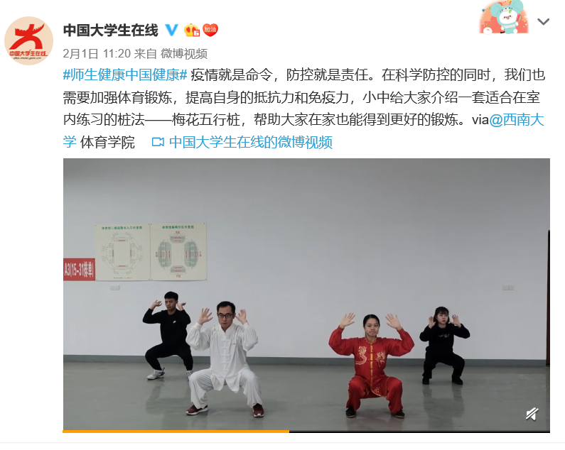 在全国人民贯彻落实党中央决策部署,众志成城战疫情、同舟共济克时艰之际,437ccm必赢国际官方网站体育学院通过学院微信公众号发布《习梅花五行桩强健体魄 更好抵御新型冠状病毒》,向学校师生及社会推广了一套适合在室内练习的健身操——“梅花五行桩”。通过视频教程及文字介绍,教大家在家隔离的同时,积极锻炼,科学防控疫情。