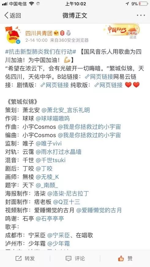 文学院2019级汉语言文学公费师范生一班赵嘉婧等同学为抗疫宣传攥写文稿、设计海报,利用微信、微博等社交媒体进行抗疫知识教育普及。2019级汉语言文学公费师范生一班岳琬清同学与四川共青团合作创作歌曲《繁城似锦》,2016级汉语言文学公费师范生一班于希涵同学借助仙桃夏令营公众号进行疫情防控知识推送。文院学子以身作则,通过微信,微博等多方平台积极参与集资捐物,为抗疫工作贡献自己的一份力量。