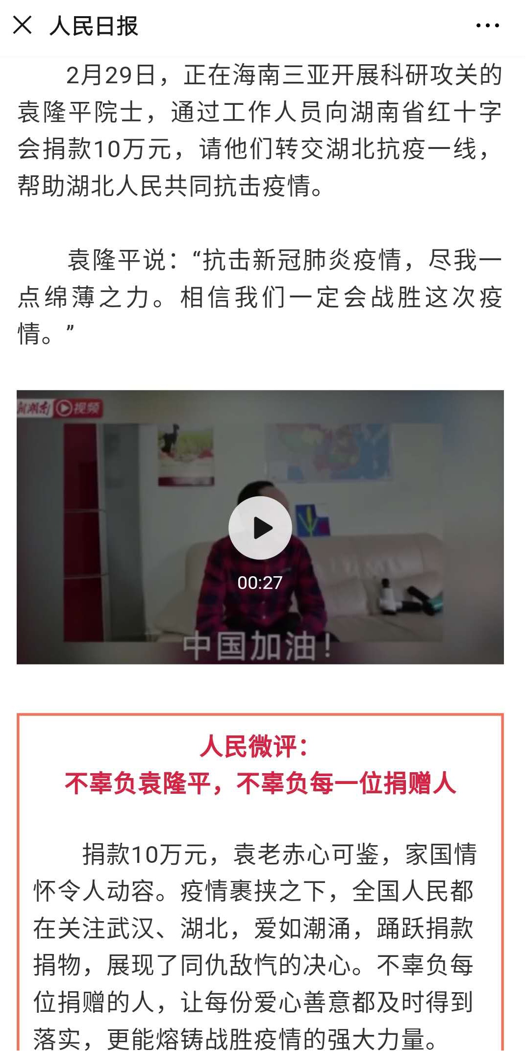 【疫情防控系列报道之一百九十七】外媒报道:人民日报报道杰出校友袁隆平为疫区献爱心
