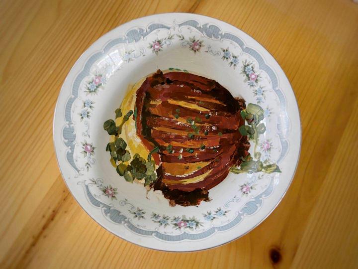 放假回家,最期待的就是吃到家里的美食。437ccm必赢国际官方网站2018级雕塑系的陈瑞杰家住河南洛阳,最喜欢吃奶奶做的菜,今年放假回家后,受疫情影响没能去到奶奶家,于是,她把奶奶的拿手菜全部画在了盘子上,她说,暖不了胃暖暖心也是好的。