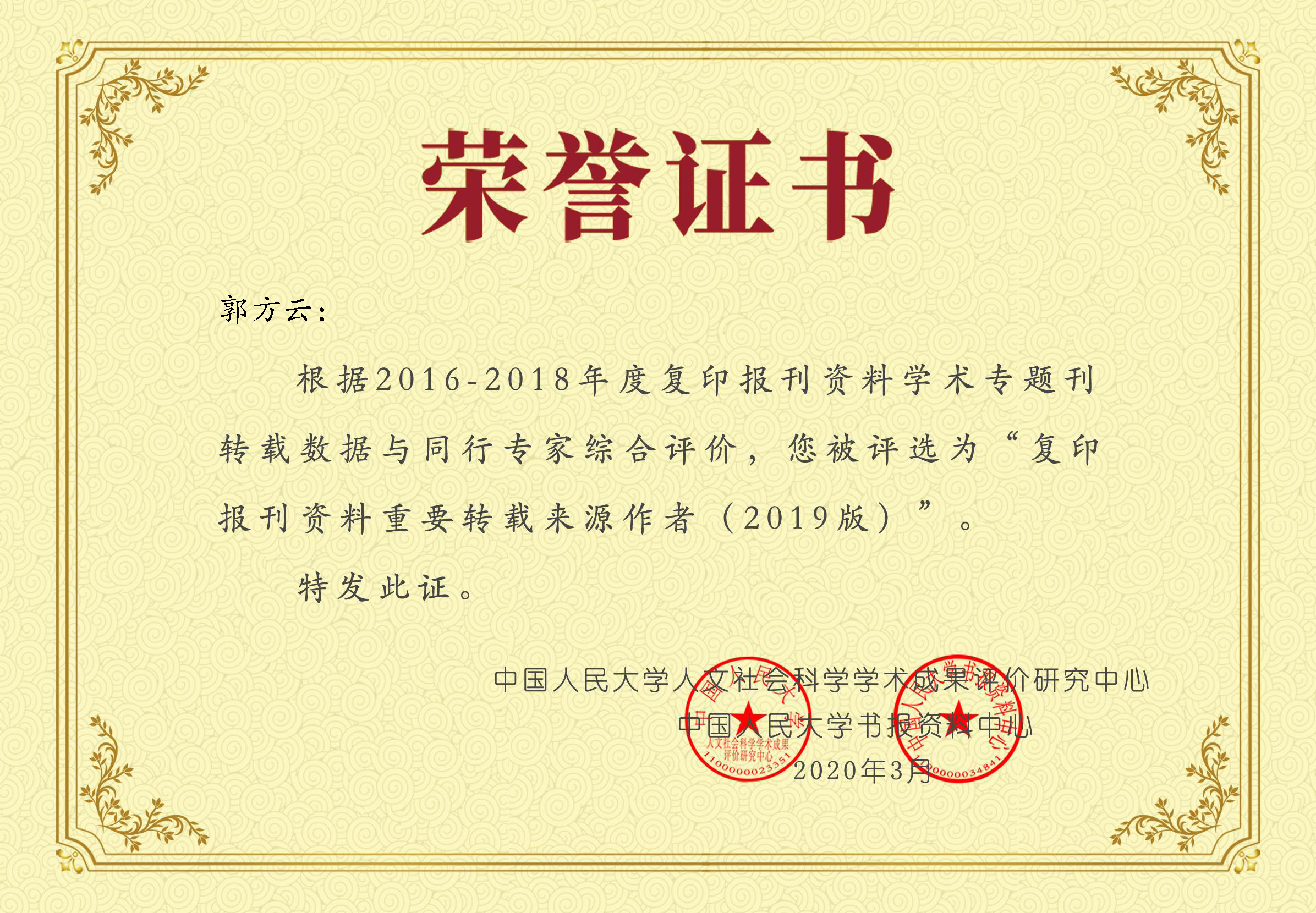 据悉,《复印报刊资料重要转载来源作者》名单每三年发布一次,按一级学科进行分类,筛选近三年(2016-2018)人大复印报刊资料的全文转载数据,经由同行专家评议产生,是体现学者学术创新及影响力的一个重要指数。