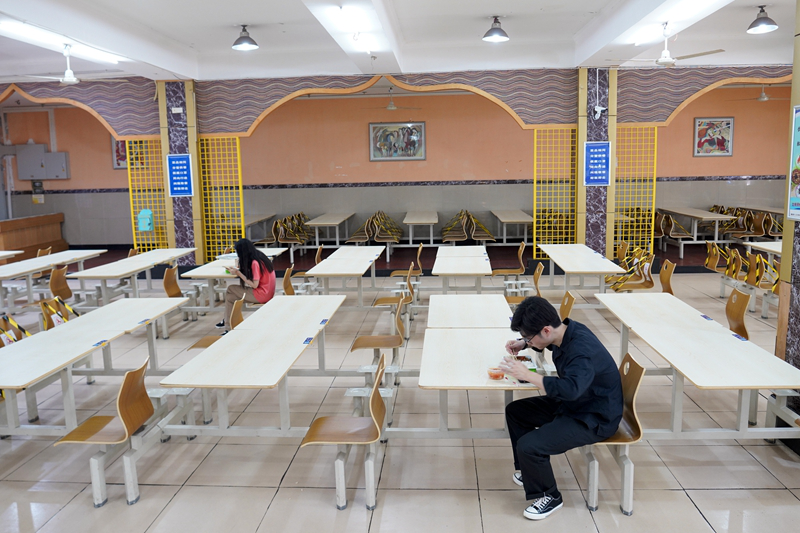5月15日,在437ccm必赢国际官方网站的一个学生食堂内,学生按照要求一人一桌吃午餐。