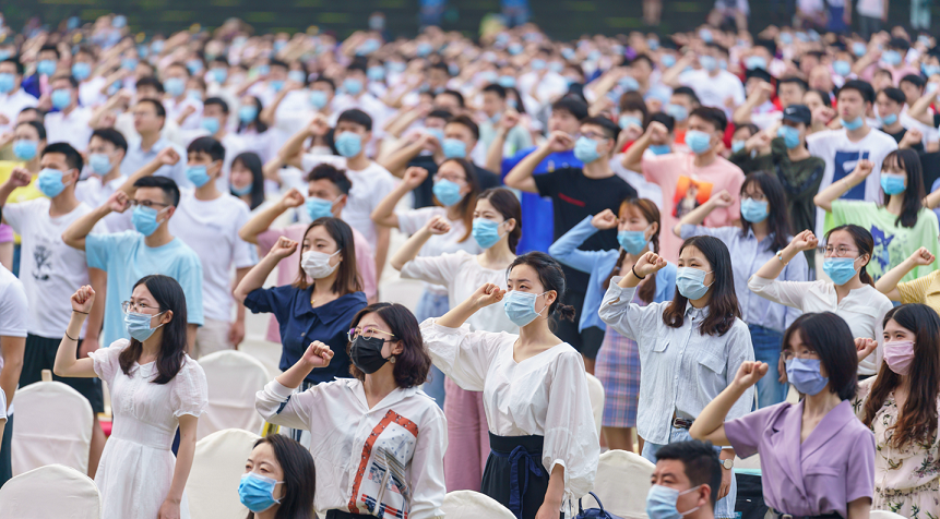 8点整,学生女子国旗班迈着坚定的步伐护送国旗出场,伴随着雄壮的国歌声,现场师生和观礼人员庄严起立,面向冉冉升起的五星红旗行注目礼。毕业典礼暨学位授予仪式在庄重的氛围中正式开始。