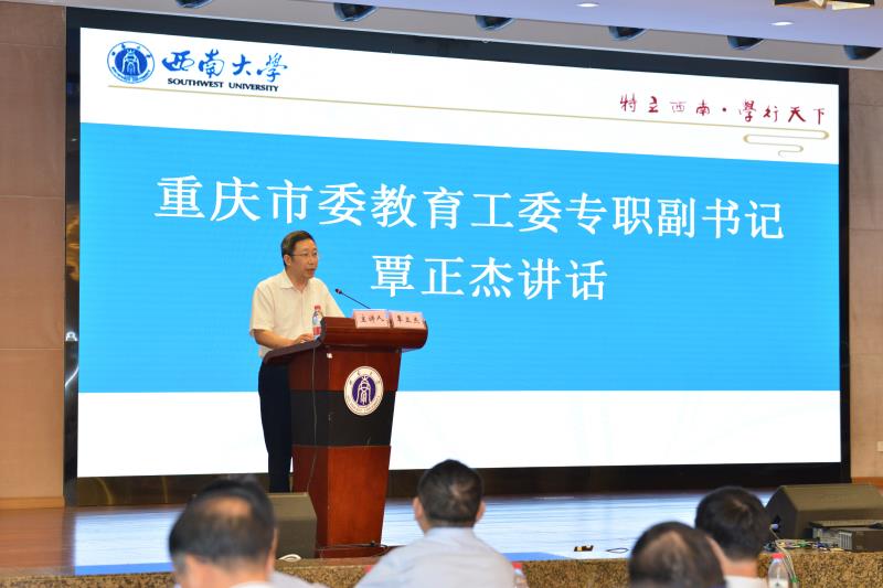 6月28日上午,由重庆市教育委员会主办、学校承办的重庆市高校推进课程思政建设研讨会在学校国际报告厅举行。受疫情影响,教育部高等教育司副司长徐青森在北京通过视频连线方式出席会议。重庆市委教育工委专职副书记覃正杰,重庆大学副校长廖瑞金等全市高校有关领导,学校党委书记李旭锋、副校长王进军出席会议。市教委高教处副处长吴岚主持会议。