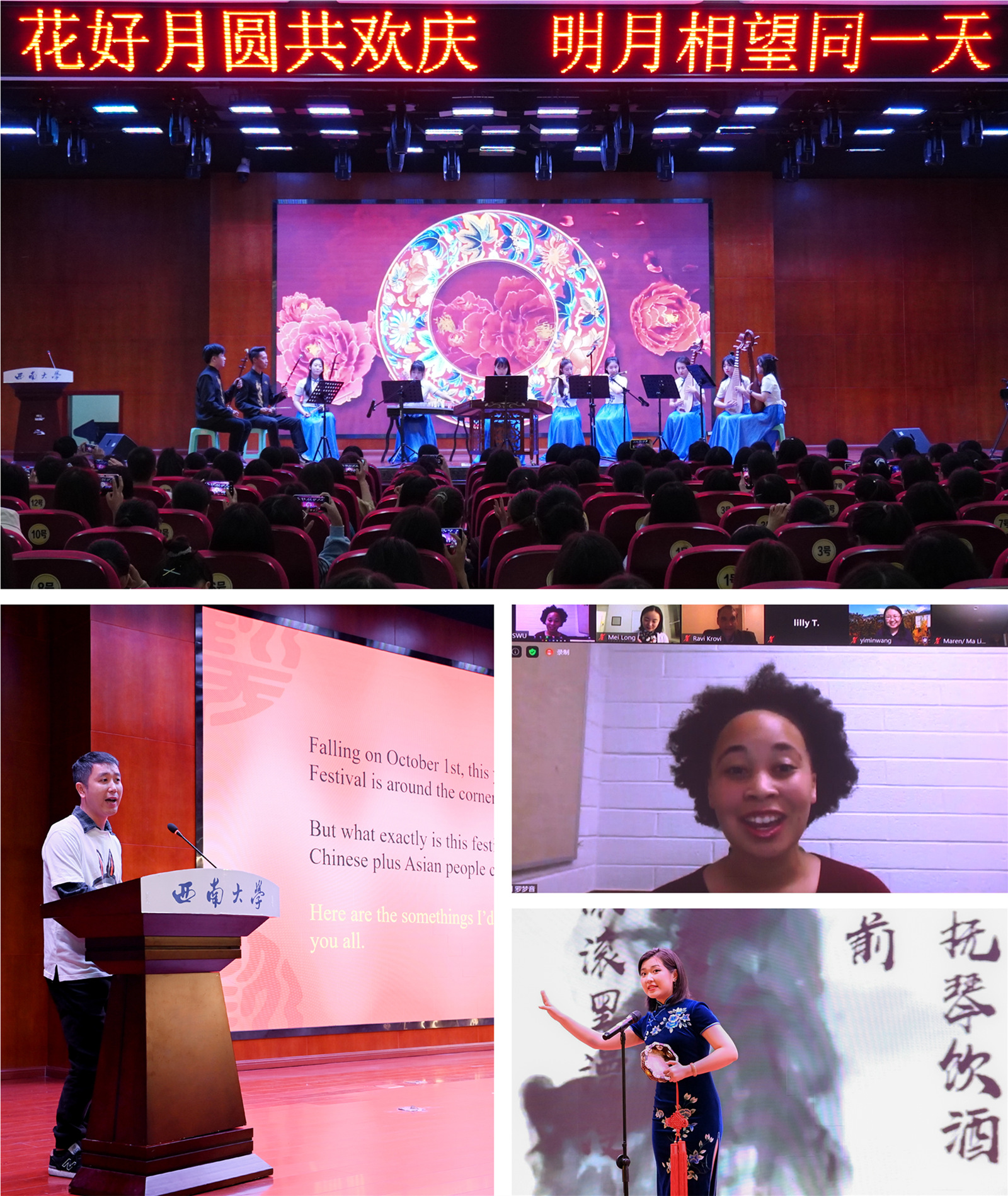 联谊会上,文学院教师周睿做题为《又到一轮月圆节》的中秋习俗讲解,学生艺术团呈现中国传统曲艺《风雨归舟》和民乐合奏《花好月圆》等两个独具特色的精彩节目。韦伯州立大学罗梦音同学用中文演唱《月亮代表我的心》,优美动听的歌声引得现场掌声雷动。两校学生代表在表演结束后交流座谈。